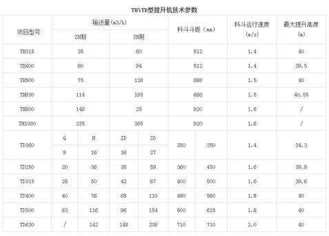 TD\TH型提升機(jī)為目前應(yīng)用較廣泛的兩款提升機(jī),TD型采用掏取式裝料,離心式卸料。特點(diǎn):適用粉狀、粒狀和小塊狀的低磨琢性物料,斗型有Q型(淺斗)、H型(弧底斗)、zd型、中深斗sd型(深斗)四種。TH型采用掏取式裝料,重力或混合式卸料,適用于1.51tm3的物料,斗型在zh型(淺斗)和sh(深斗)兩種。
